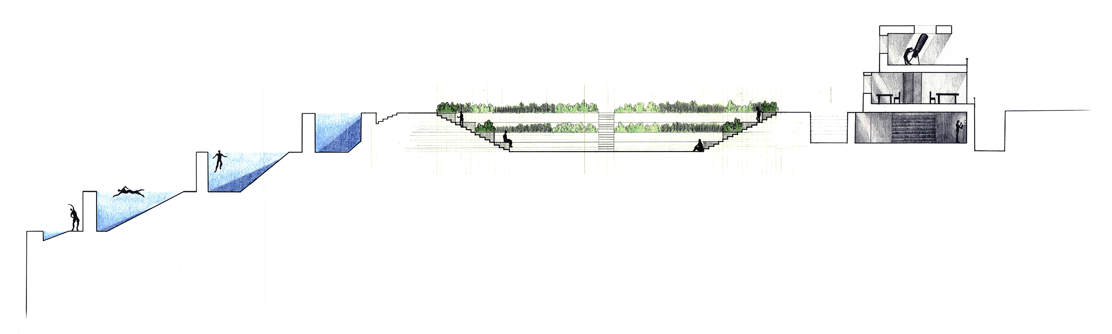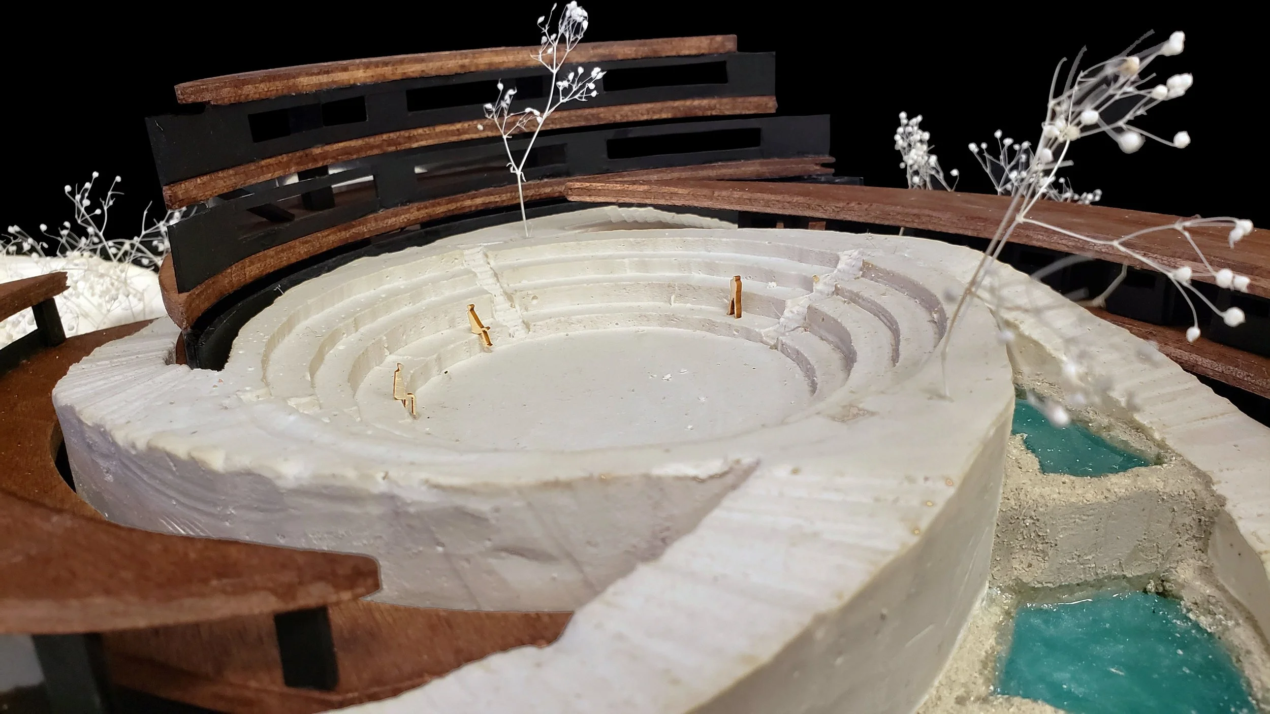 I ultimately developed the monastery as a series of crescent-shaped buildings arranged around a circular cloister, with the central garden acting as the primary focus. This garden replaced the traditional chapel and was positioned at the highest point of the landscape, reinforcing the sun and moon theme. The design embraced the steep topography, embedding the monastery into the mountain while maintaining a harmonious connection with the natural environment. The circulation path was carefully choreographed, guiding visitors through the complex while always returning them to the central garden, creating a sense of hierarchy and spiritual focus.