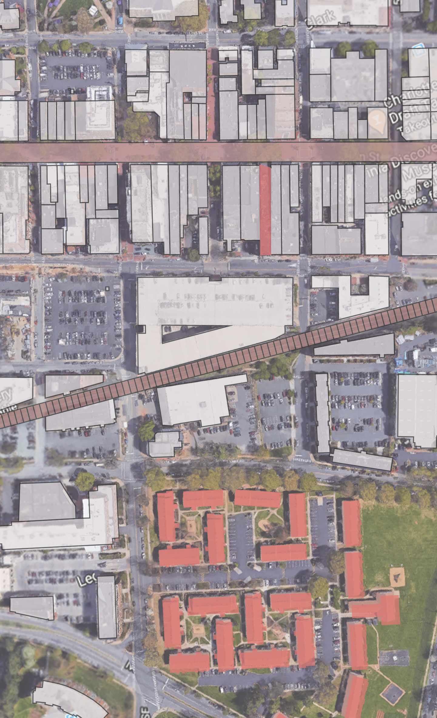 Charlottesville, like many older American cities, has a history of using its topography to segregate people of color and lower-income residents. On Heather Heyer Way, the divide is stark—private businesses catering to the wealthy are located uphill, while further down near the railroad, there’s a noticeable economic shift. The public housing complex just beyond the railroad is within walking distance of the mall, yet largely hidden from view, symbolizing the “out of sight, out of mind” attitude toward economic disparity.