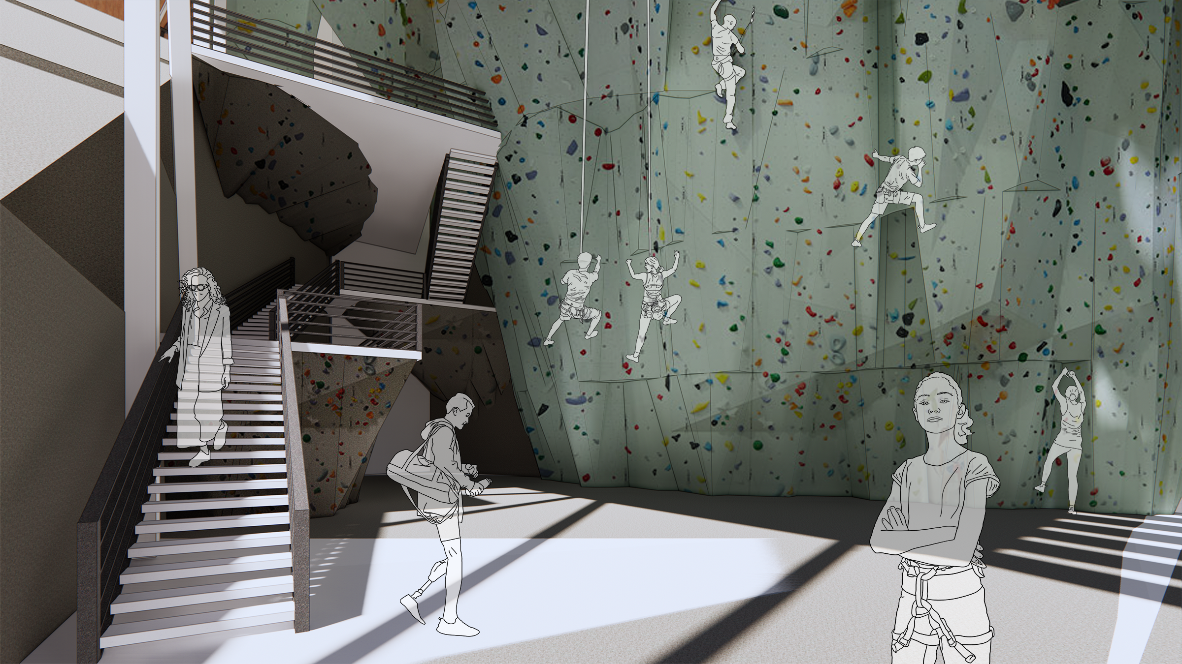 Inside, the main floor leads to the café and rental area, or directly through a breezeway to the rock wall. The lower level houses private gym spaces and locker rooms, with the experience resembling a descent into a cave, guided by exposed rock walls. The roof slopes to direct water flow towards the entrance and pool. The climbing room is filled with staircases and overlooks, reflecting the quarry’s descending paths and providing numerous stopping points along the way.