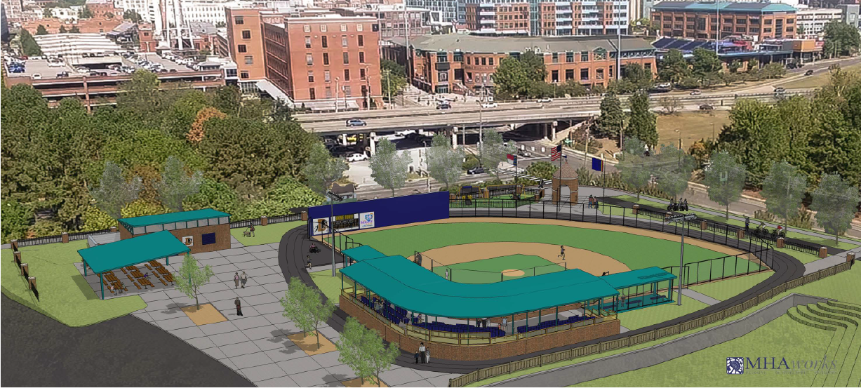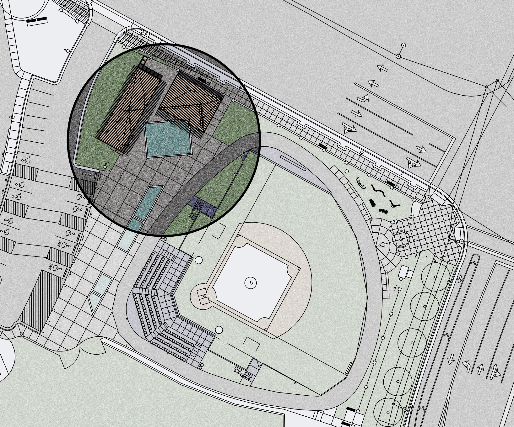 This project involved designing a cooling station for the Durham Miracle League, a baseball field for children with special needs. The program requirements included a central gathering area, accessible bathrooms and changing rooms, a food service area, and storage spaces. Located near the American Tobacco Trail, accessibility was key to the design.