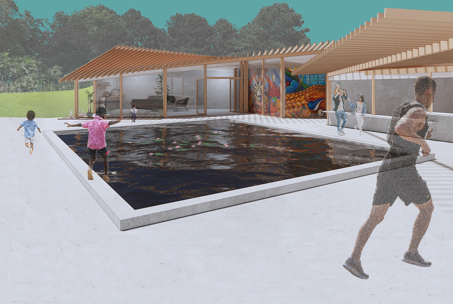 My primary goal was to use the building’s form and orientation to combat North Carolina’s variable climate. The building is positioned to block direct sunlight during hot summer games, while a sloped roof helps direct wind and water. A water path leads from the entrance to the central courtyard, which features a splash pool joining two connected buildings. Keeping the entire structure on one level ensures ease of access.