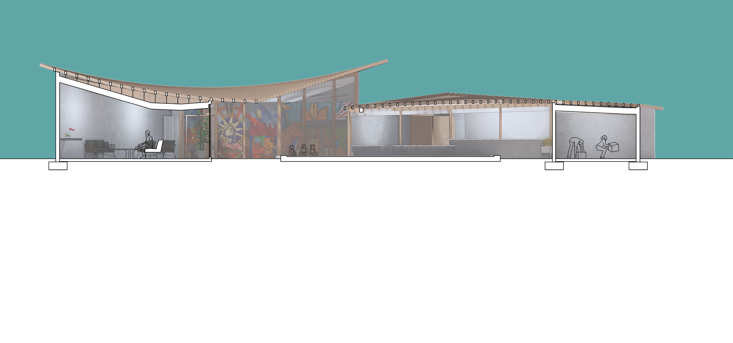 The design features an offset square courtyard over two rectangular buildings, creating a clear separation of spaces. The central “pinch” in the main building divides the gathering area from the bathrooms. The roof structure not only guides water but also creates a shaded overhang at the entrance and food service area. The bathrooms are insulated with a double wall that doubles as a canvas for local muralists, adding artistic value while providing protection from the elements.