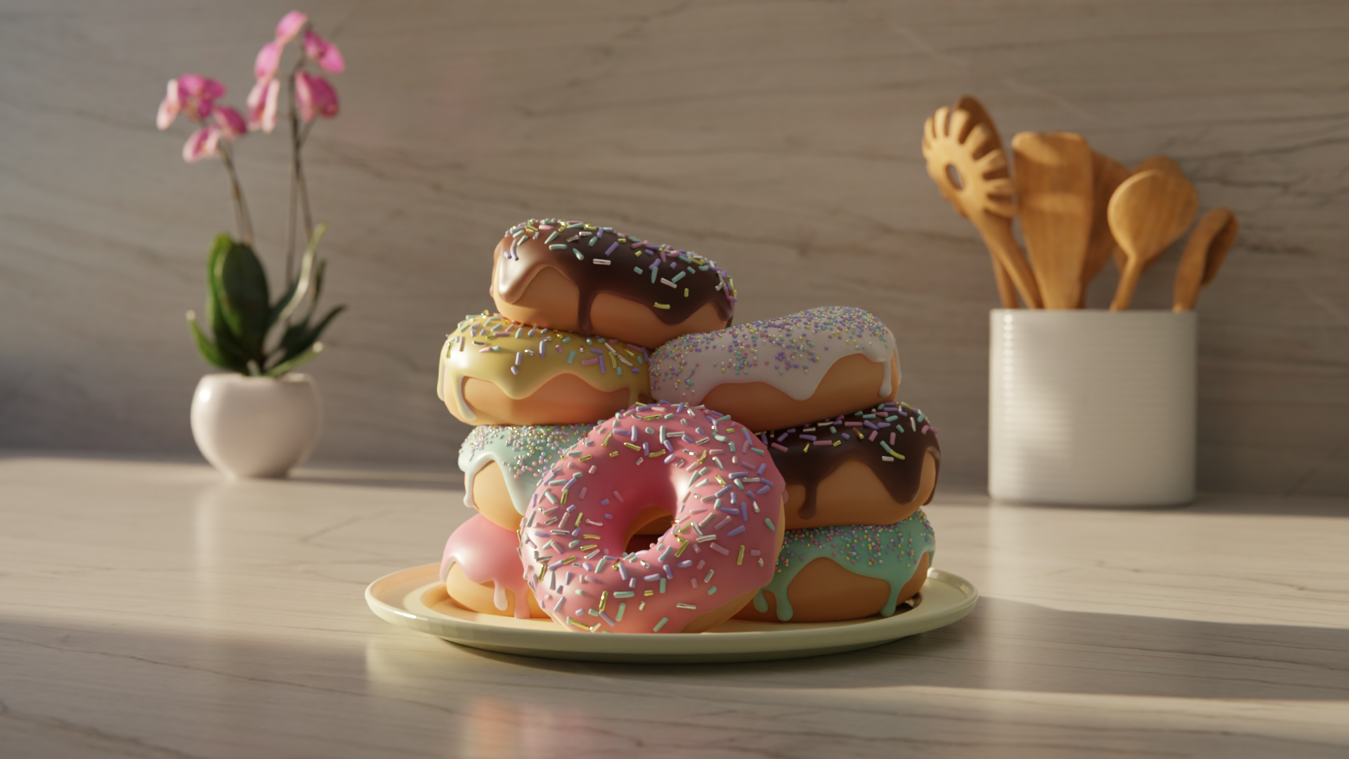 In this updated 3D donut, I focused on creating a realistic scene, incorporating a countertop with soft morning light that bathes the donut and adds depth to the composition. The donut is in sharp focus, with a shallow depth of field that renders the plants and kitchen utensils in the background with a smooth, natural bokeh. Subtle subsurface scattering in the icing gives it a rich, semi-translucent quality. This piece reflects my progress in modeling and lighting, bringing the donut to life in a more sophisticated, atmospheric setting.